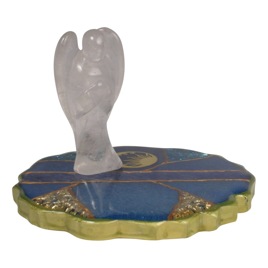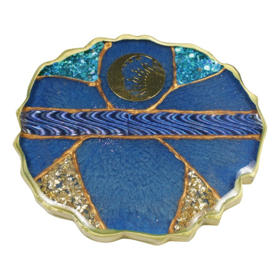 Details blauwe epoxy coaster zon/maan met Bergkristal engel