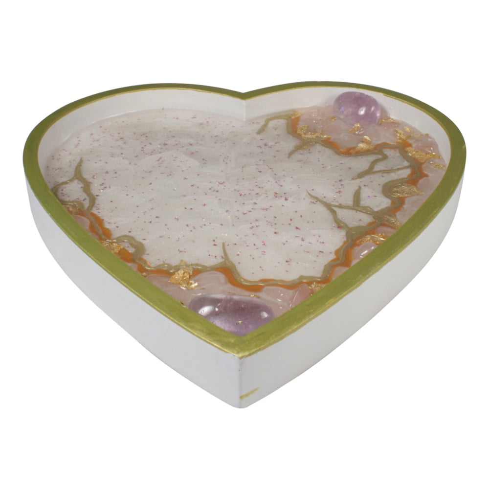 Dienblaadje of display gemaakt van hout, giethars en mooie paarse Amethisten en roze Rozenkwarts steentjes. Handgemaakt door Hoseki en dus maar 1 van op voorraad. Het houten dienblaadje is gegoten met glinsterende witte parelmoer van giethars / Resin. Deze hars of epoxy is ingelegd met Amethist en Rozenkwarts en goud bladpapier. De doorzichtige en heldere Amethist hebben we speciaal voor dit product uitgezocht. U kunt deze woonsaccessoire gebruiken voor uw kristallen, edelstenen of onder andere uw kaarsen.